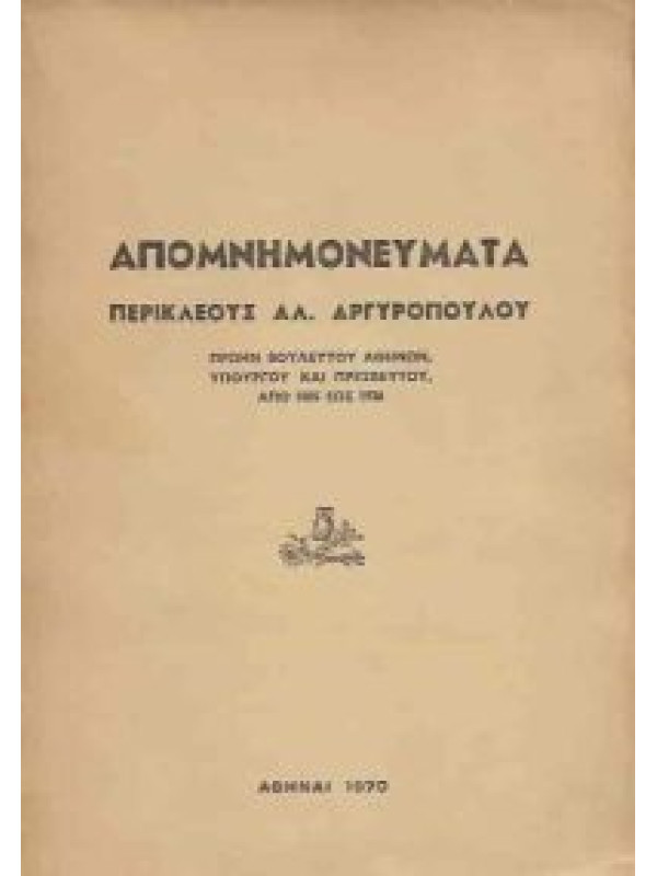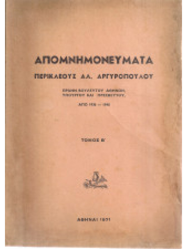 Απομνημονεύματα Περικλέους Αλ. Αργυρόπουλου πρώην βουλευτού Αθηνών, υπουργού και πρεσβευτού από 1885 έως 1936 και από 1936 έως 1948 (2 τόμοι)