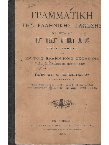 Παπαβασιλείου ΓεώργιοςΓραμματική της Ελληνικής γλώσσης μάλιστα δε του πεζου Αττικού λογου Παπαβασιλειου ΓεώργιοςΓραμματική της Ελληνικής γλώσσης μάλιστα δε του πεζου Αττικού λογου..