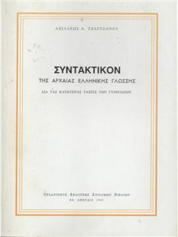 Τζάρτζανος Αχιλλέας Α Συντακτικόν της αρχαίας ελληνικής γλώσσης,Τζάρτζανος Αχιλλέας Α Συντακτικόν της αρχαίας ελληνικής γλώσσης.. Product #: 9788888928975 Regular price: €10.00 €10.00 Σε απόθεμα