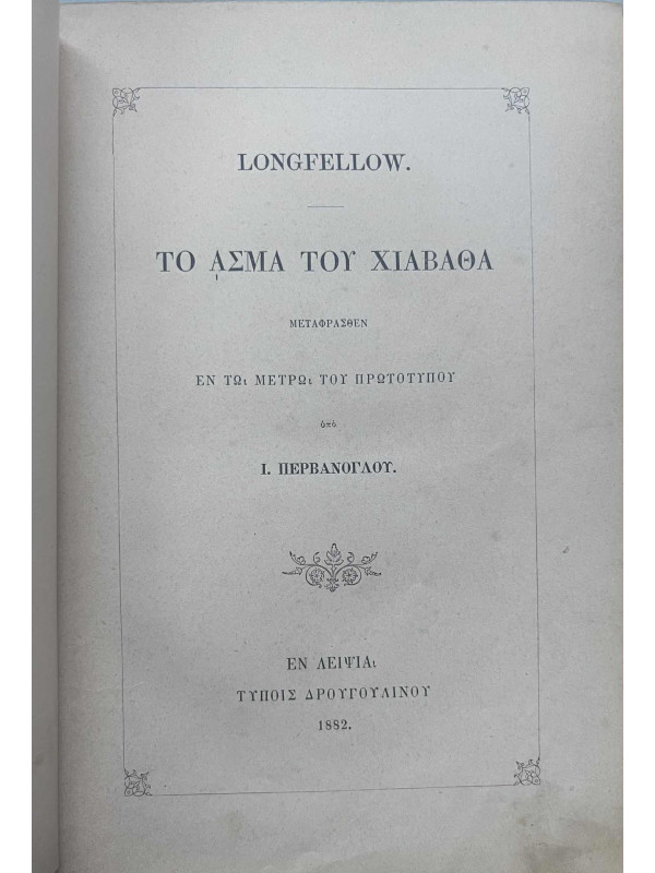 Μεταφρασθέν εν τω μέτρω του πρωτοτύπου υπο Iωάννη Περβάνογλου Εν Λειψία, τύποις Δρουγουλίνου, 1882.