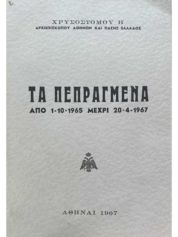 Χρυσόστομος Β' Τα πεπραγμένα από 1-10-1965 μέχρι 20-4-1967, Χρυσόστομος Β' Τα πεπραγμένα από 1-10-1965 μέχρι 20-4-1967, Χρυσόστομος Β'.. Product #: 9788888991337 Regular price: €20.00 €20.00 Σε απόθεμα