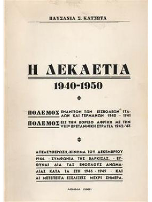 Πόλεμος εναντίον των εισβολέων Ιταλών και Γερμανών 1940-0941 Πόλεμος εις την Β.Αφρική με την VIIIη Βρεταννική στρατιά1942 - Απελευθέρωση-κίνημα του Δεκεμβρίου 1944.- Συμφωνία της αβάρκιζας.- Εθύναι διά τας ενόπλους ανωμαλίας κατά τα έτη 1946-1949. -Κι Αι μετέπειτα εξελίξεις μέχρι σήμερα